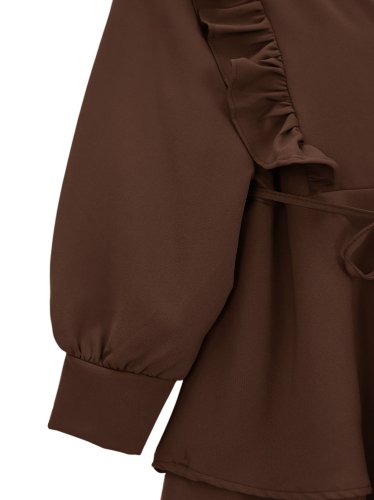Önü Fırfırlı Bağcıklı Eteği Katlı Pantolonlu Kimono Takım -Kahve