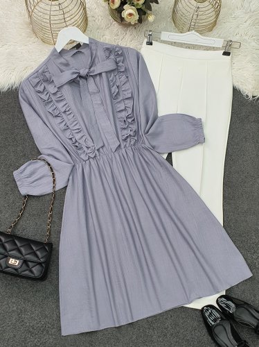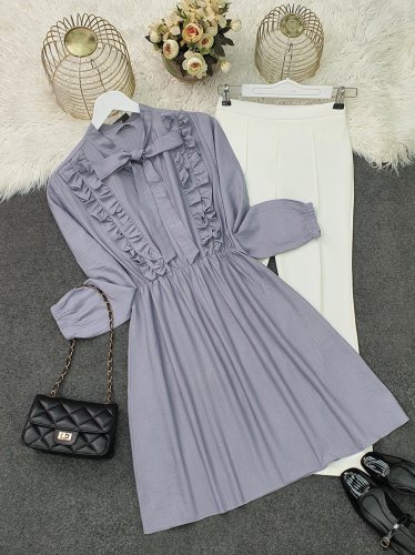 Yakası Bağcıklı Fırfırlı Ayrobin Tunik -Açık Gri