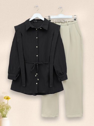 İnci Düğmeli Omuzu Ve Beli Bağlamalı Krinkıl Gömlek -Siyah