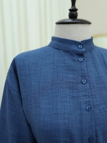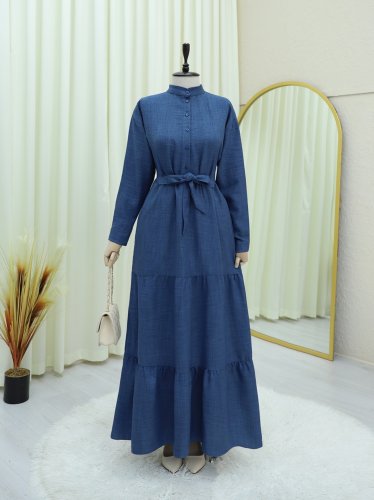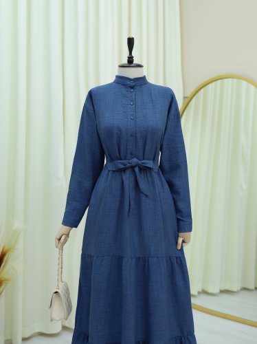 Yarım Düğmeli Dik Yaka Beli Bağlamalı Keten Elbise -İndigo