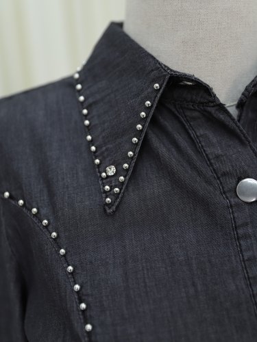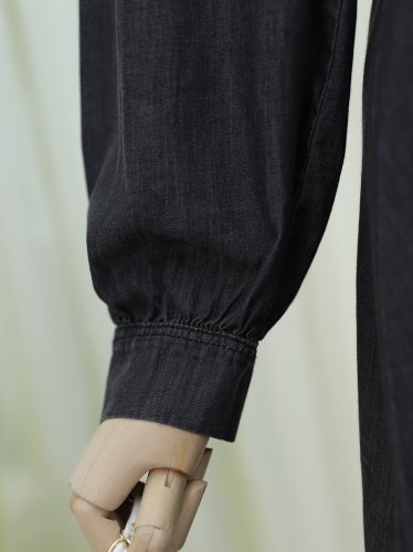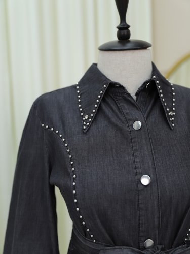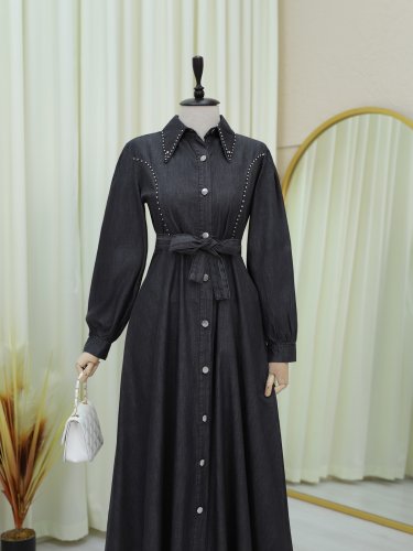 Belden Bağlamalı Önü Düğmeli Boncuklu Kot Elbise -Antrasit