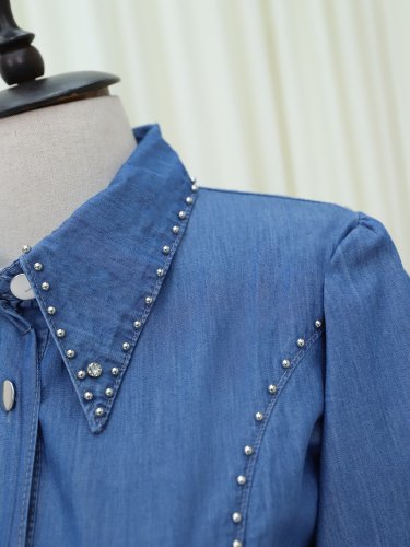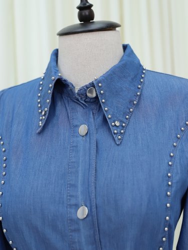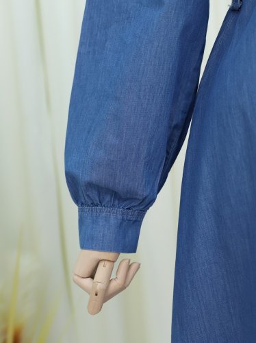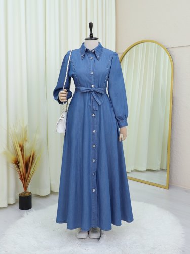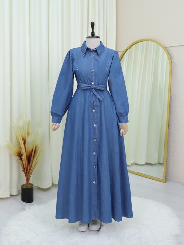 Belden Bağlamalı Önü Düğmeli Boncuklu Kot Elbise -Mavi