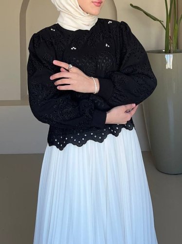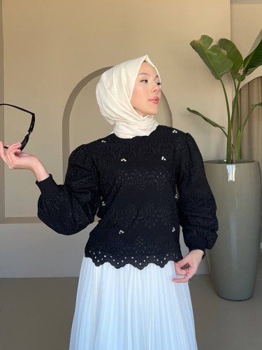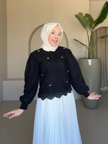 Yuvarlak Yaka Taşlı Astarlı Tunik -Siyah