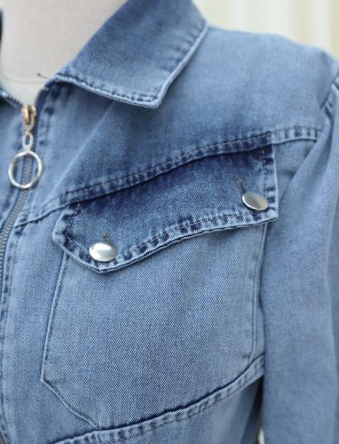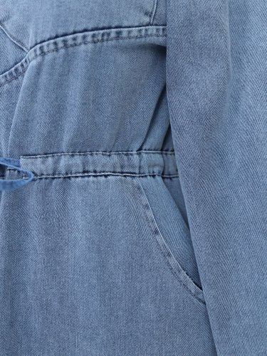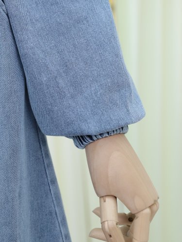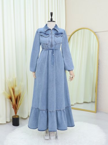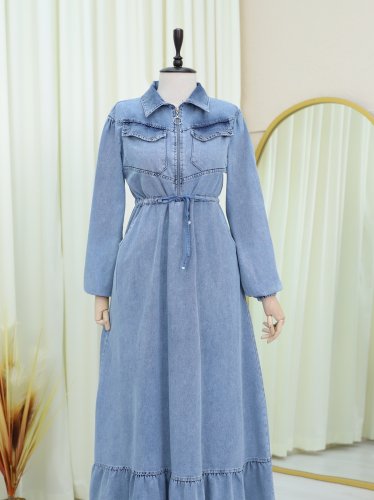 Yarım Fermuarlı Tünel Bağcıklı Kolu Lastikli Kot Elbise -Buz Mavi
