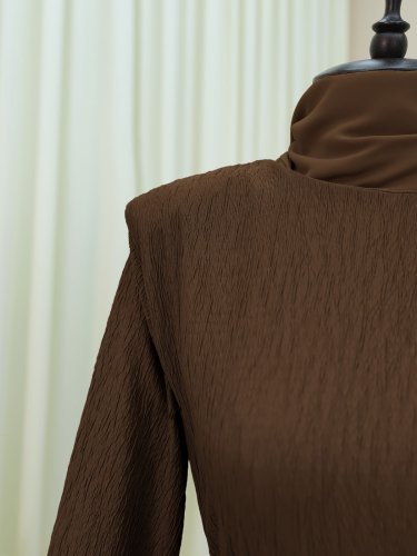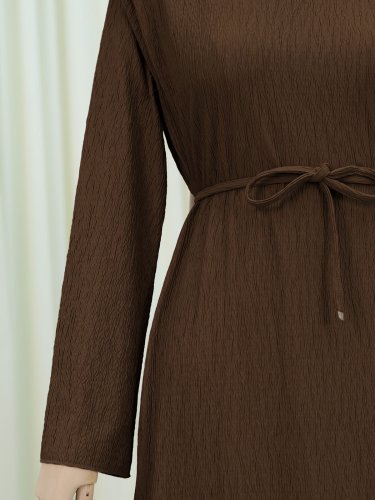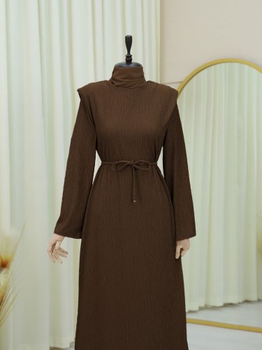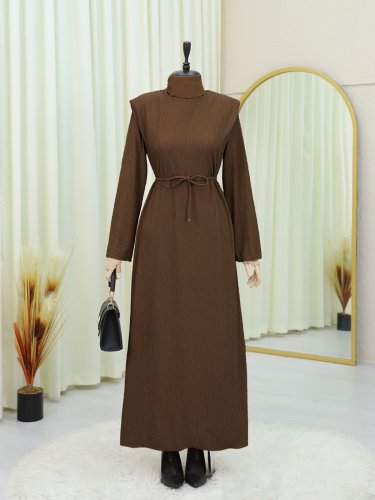 Omuzu Vatkalı Bağcıklı Bürümcük Elbise -Kahve