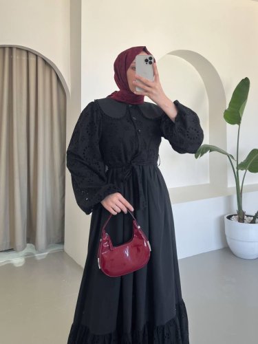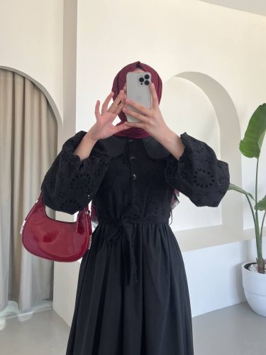Bebe Yaka Yarım Düğmeli Fistolu Elbise -Siyah