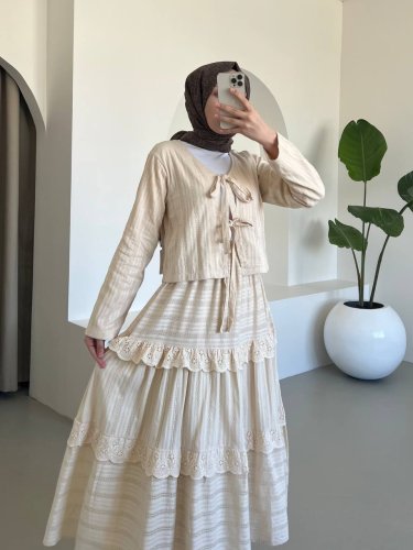 Önü Bağlamalı Fistolu Etekli Takım -Bej