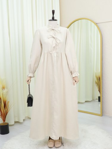 Yarım Patlı Bağcıklı Kolu Lastikli Müslin Elbise -Taş