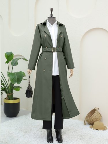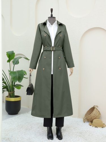 Çift Düğmeli Kemerli Trençkot -Haki