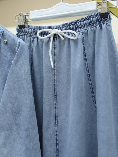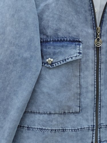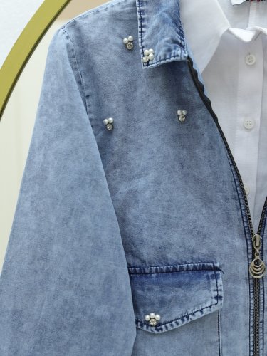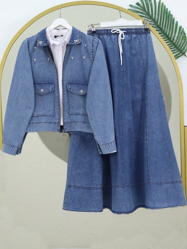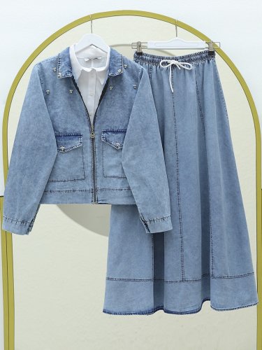 Serpme İncili Fermuarlı Ceket Etek Kot Takım -Buz Mavi