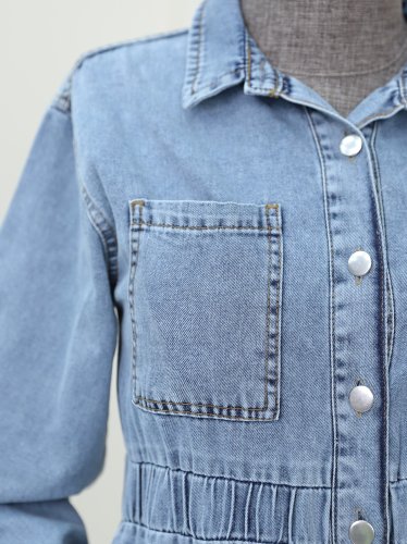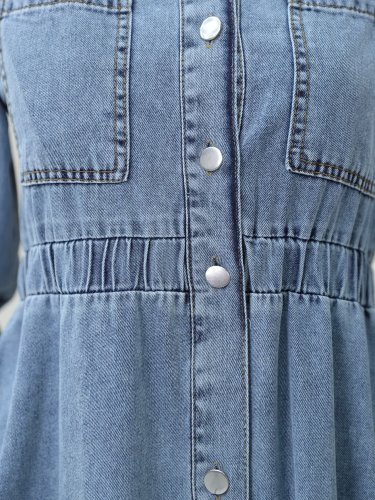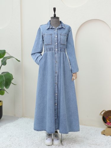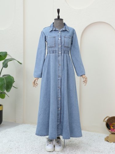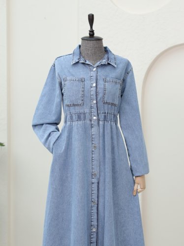 Beli Lastikli Yan Cepli Kot Elbise -Buz Mavi