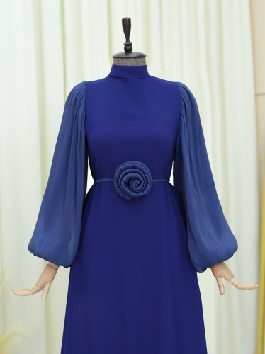 Balon Kol Manşeti Lastikli Güllü Kemerli Elbise -Laci