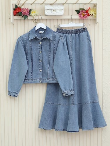 Etek Ucu Volanlı Düğmeli Ceketli Kot takım -Buz Mavi