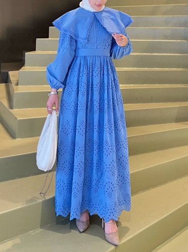 Pelerin Yaka Dantel Detaylı Elbise -Mavi