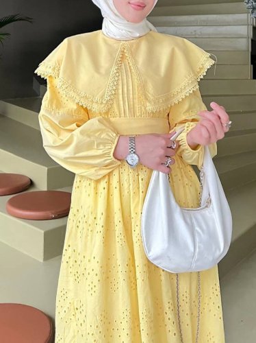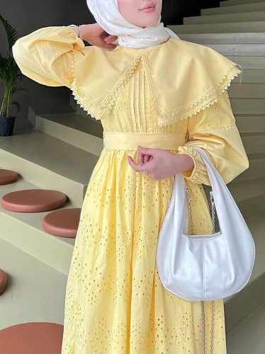 Pelerin Yaka Dantel Detaylı Elbise -Sarı