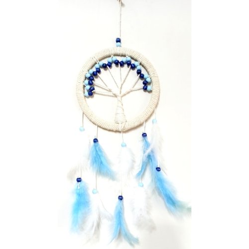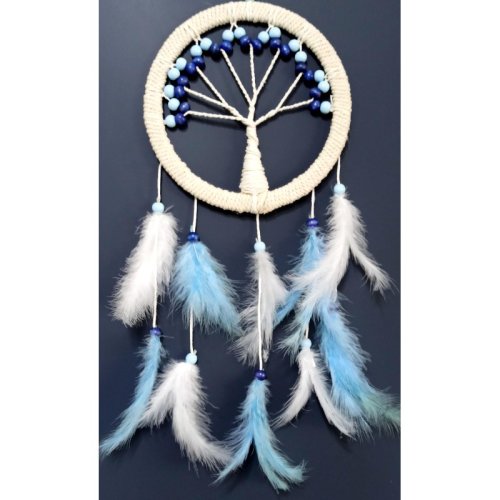 Mavi Beyaz Kuş Tüylü Hayat Ağacı Düş Kapanı Duvar Süsü