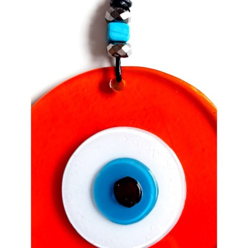 Mavi Nazar Boncuklu El Yapımı Deri İpli Turuncu Renk Şeffaf Cam Duvar Süsü
