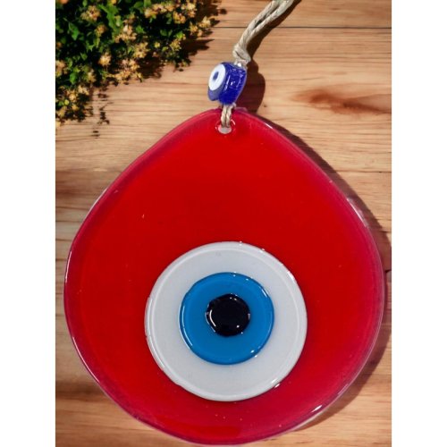 Mavi Nazar Boncuklu Şeffaf Kırmızı Renk Nazar Boncuklu Damla Desen El Yapımı Duvar Süsü