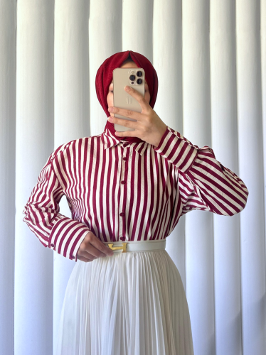 Çizgili Oversize Düğmeli Gömlek -Bordo