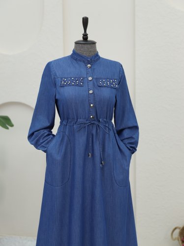 Taşlı Cep Detaylı Tünel Bağcıklı Kot Elbise -İndigo