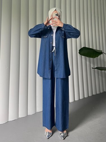 Düğmeli Cep Detaylı Bol Paça Pantolonlu Kot Takım -İndigo