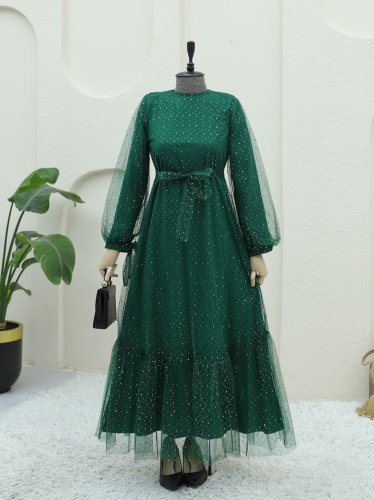 Serpme Pul Detaylı Kolu Bağcıklı Tül Elbise -Zümrüt