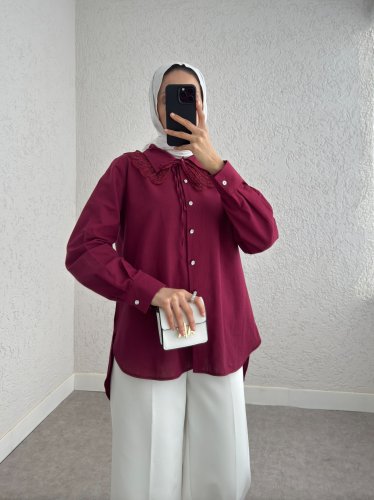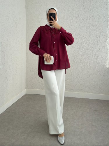 Yakalık Detaylı Arkası Uzun Düğmeli Gömlek -Bordo