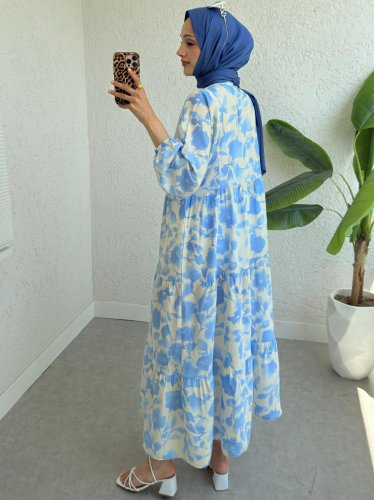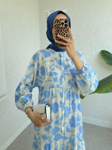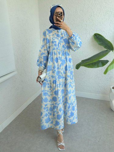 Yarım Düğmeli Kolu Lastikli Desenli Elbise -Mavi