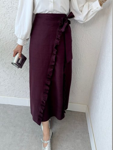 Beli Bağlamalı Çift Kat Yırtmaçlı Fırfırlı Etek -Mürdüm