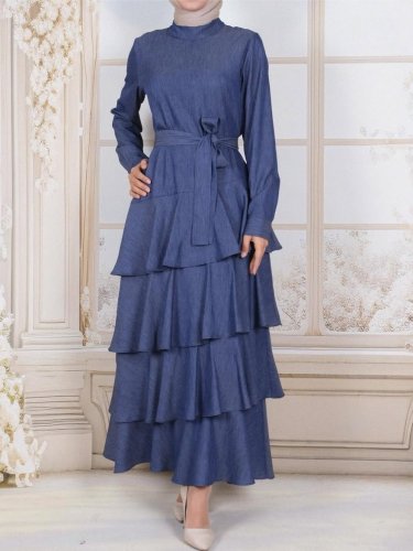Eteği Katlı Tensel Kot Kemerli Elbise -İndigo