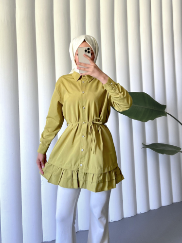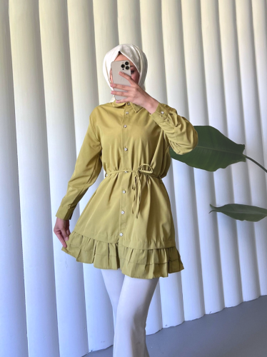 Etek Ucu Katlı Fırfırlı Düğmeli Poplin Gömlek Tunik -Yağ Yeşili