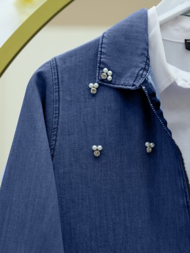 Serpme İncili Fermuarlı Ceket Etek Kot Takım -İndigo