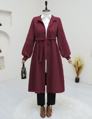 Hakim Yaka Tünel Bağcıklı Kaşe Kaban -Bordo