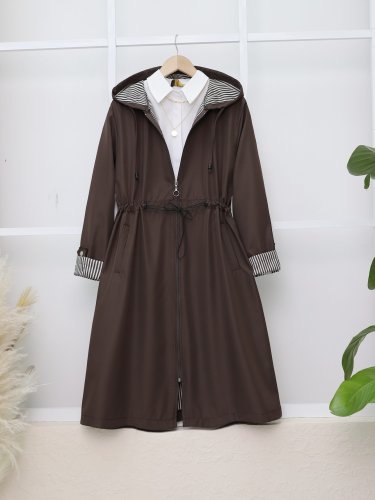 Beli Lastikli Kolu Katlamalı Kapşonlu Trenckot -K Kahve