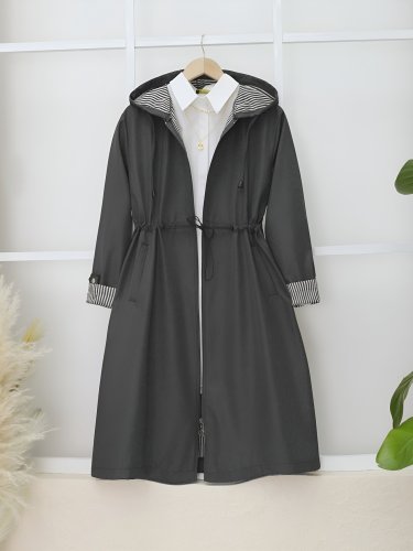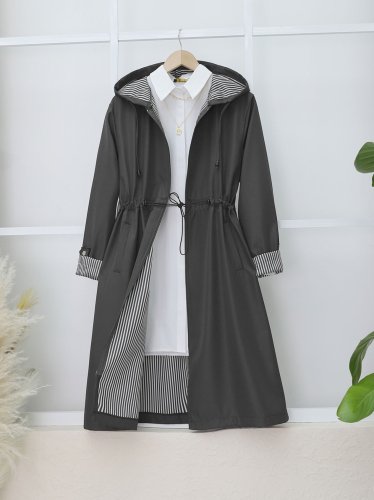 Beli Lastikli Kolu Katlamalı Kapşonlu Trenckot -Antrasit