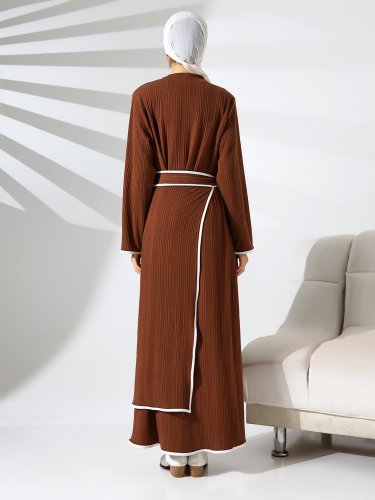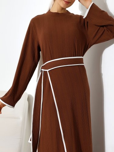Dik Yaka Örme Krep Beli Bağlamalı İki Parçalı Elbise -Taba