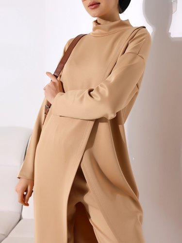 Dik Yaka Önü Çift Kat Tunik Pantolon Scuba Takım -Vizon