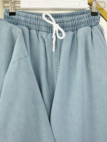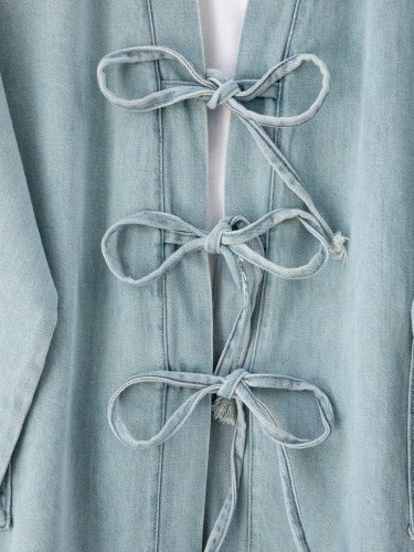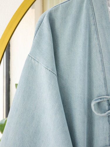 Önü Bağlamalı Cepli Pantolonlu Kot Kimono Takım -Açık Mavi