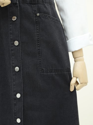 Boydan Düğmeli Çift Cepli Kot Salopet -Siyah