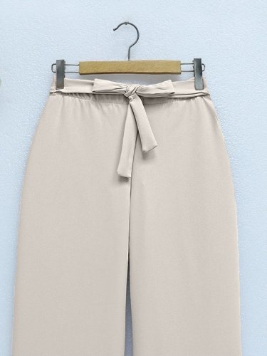 Beli Lastikli Bağlamalı Bol Paça Pantolon -Bej