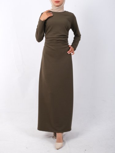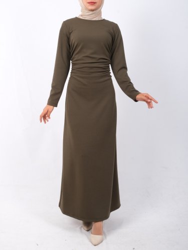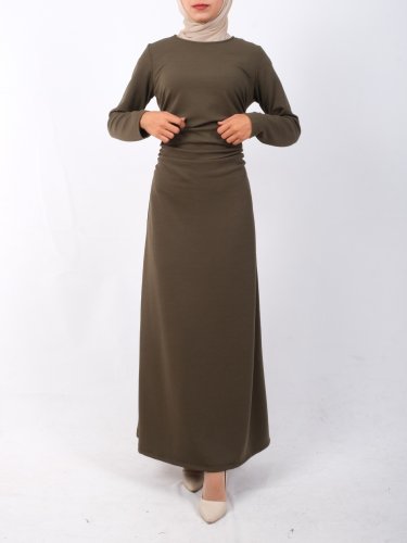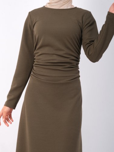 Belden Büzgülü Örme Krep Likralı Elbise -Haki