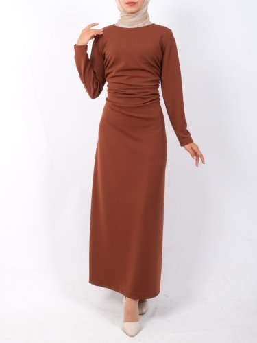 Belden Büzgülü Örme Krep Likralı Elbise -Taba