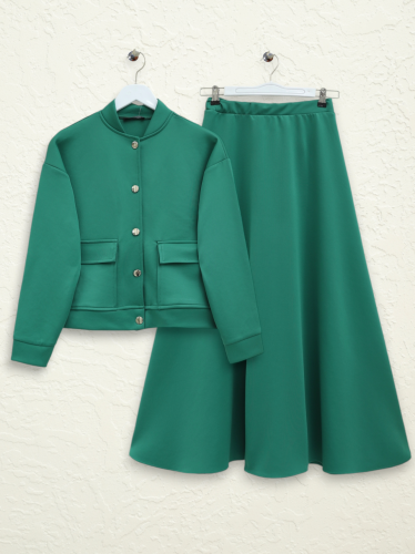 Çift Cepli Metal Düğmeli Etekli Takım -Zümrüt