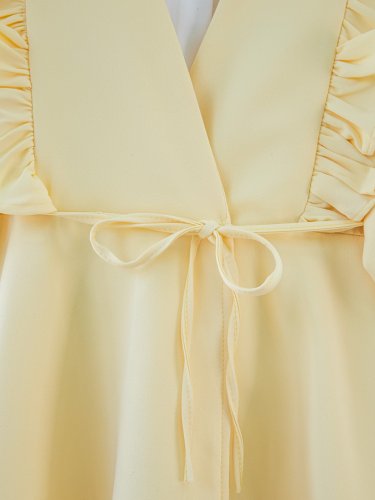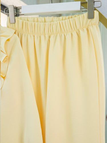 Önü Fırfırlı Bağcıklı Eteği Katlı Pantolonlu Kimono Takım -Açık Sarı