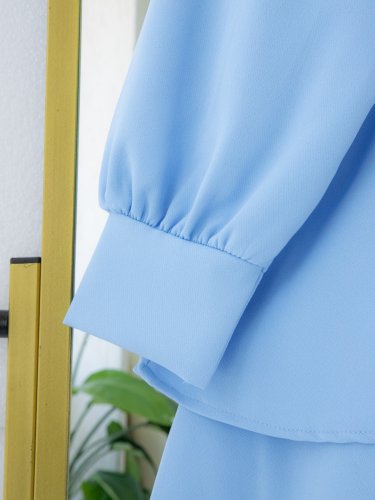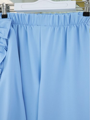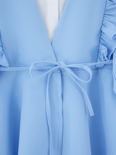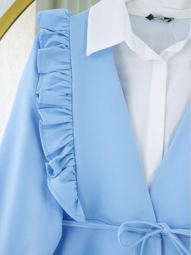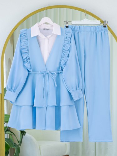 Önü Fırfırlı Bağcıklı Eteği Katlı Pantolonlu Kimono Takım -Bebe Mavi