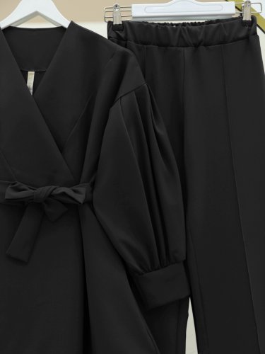 Çapraz Yaka Gül Detaylı Kemerli İkili Takım -Siyah