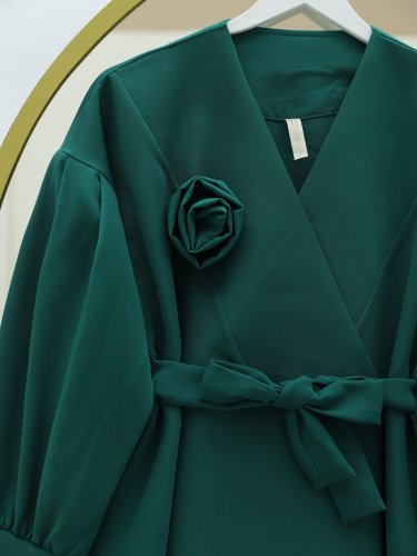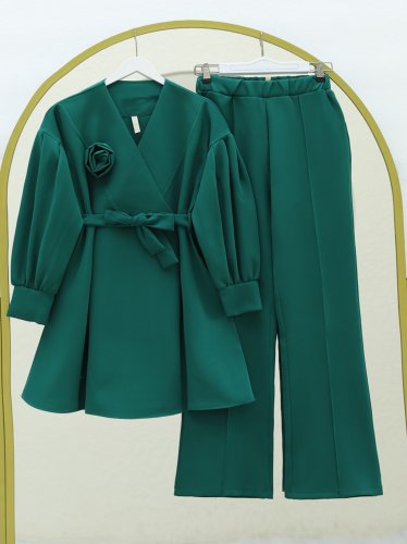 Çapraz Yaka Gül Detaylı Kemerli İkili Takım -Zümrüt
