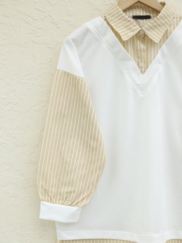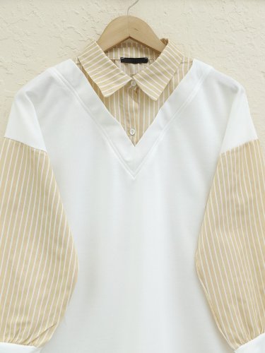 Çizgili Gömlek Detaylı Sweat Tunik -Açık Vizon