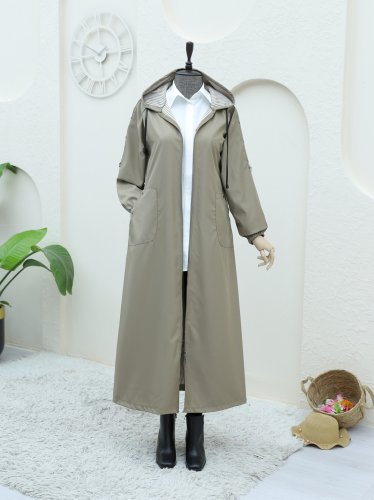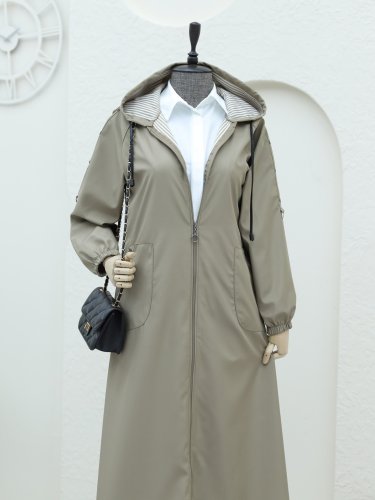 Metal Detaylı Fermuarlı Kapşonlu Trenckot -Vizon