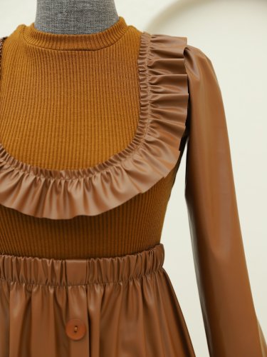 Önü Fırfırlı Triko Detaylı Deri Elbise -Taba